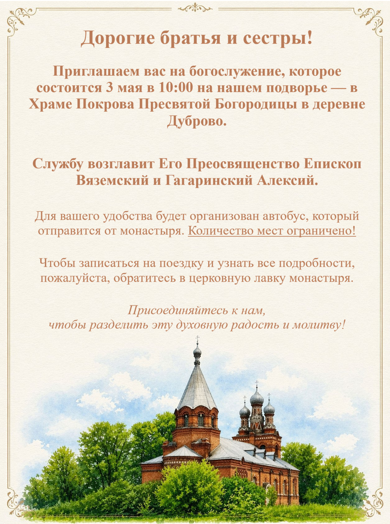 Информируем вас о том, что в настоящее время в храме Покрова Пресвятой Богородицы проводятся ремонтные работы. В связи с этим богослужения проходят нерегулярно и редко.